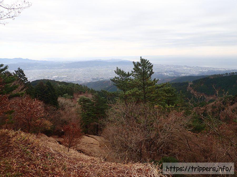 視界が開けた後方を振り返ると、小田原の街並みが見えます。天気が良ければ江の島まで見れそうです。
