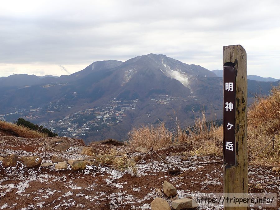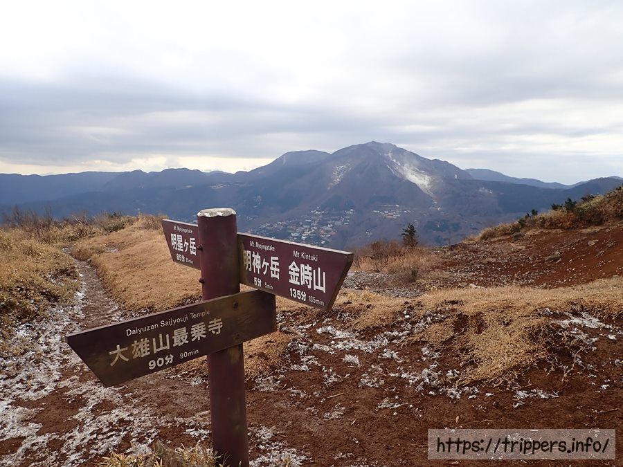 今日登る山は明神ヶ岳と明星ヶ岳で、箱根の外輪山になります。関東からは電車とバスで行く事が出来、大涌谷や富士山などの展望があるのは明神ヶ岳になるため、そこでご飯にします。標高は明星ヶ岳よりも明神ヶ岳の方が高いですが、それでも標高1,169mと低山であるため冬でも気軽に登れます。同じ外輪山にある日本三百名山の金時山と一緒に登る事も出来ます。