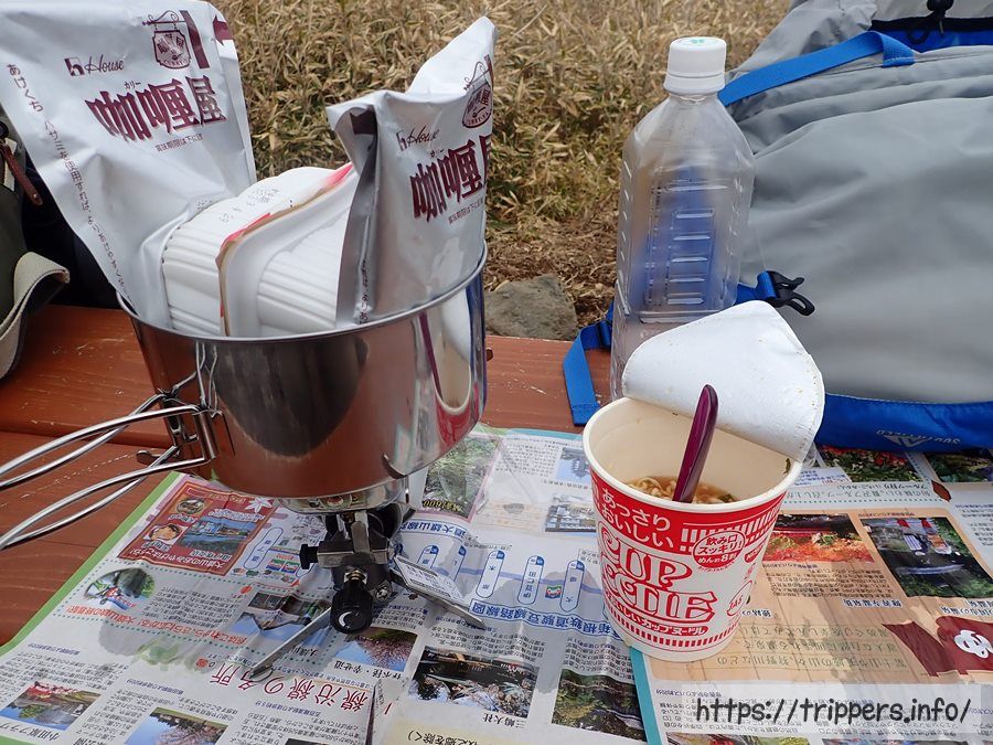 昼食の用意ができました。レトルトカレーとカップヌードルです。温めただけの料理ですが、寒い日には体がポカポカします。