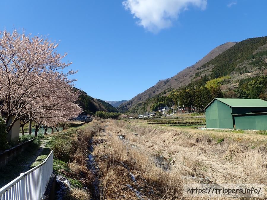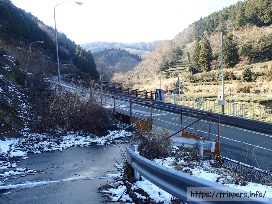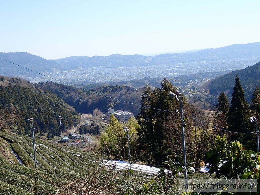 勾配のある車道を登って行くと茶畑に辿り着きます。向こうの雪が被っている山は丹沢山塊です。