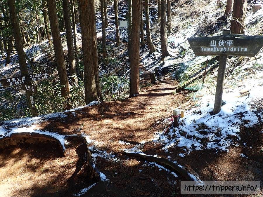 清水峠(山伏平)は分岐点になっています。大野山の登山口が近くにある洒水ノ滝へ下っていけるようです。今回は足柄峠へ進みます。