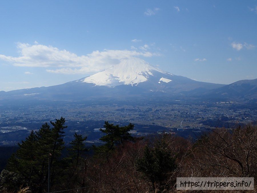 右手の尾根をずっと左に伝った中央の山が日本三百名山の金時山です。右奥には日本二百名山の愛鷹山、左には箱根の大涌谷が見えます。