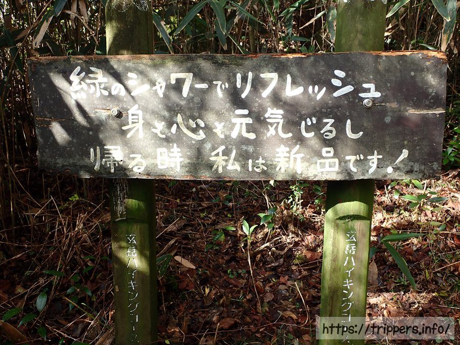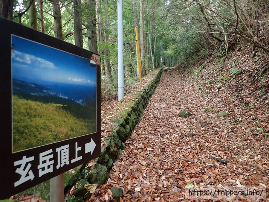 食後は玄岳ハイクコース入口バス停へ下山します。ただどこから下山して良いのか分からず、探索していると、ここが下山への入口になっていました。玄岳インターチェンジそばのカーブを少し登った先に登山道があり、看板はありますが朽ちており何も書かれていないため戸惑います。