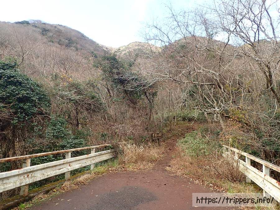車道を下って行くと、行きに通った車道と登山道が交差する橋が見えてきました。ここからバス停までは行きと同じ道を歩いて行きます。
