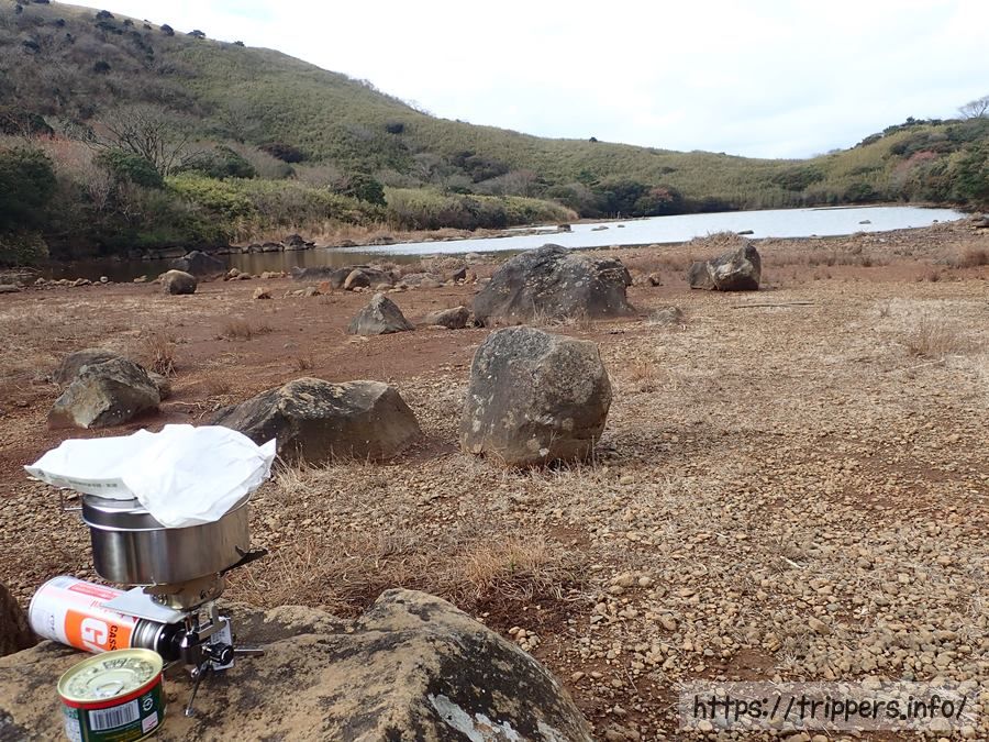 昼食タイムです。山頂よりは風が弱いですが、それでも結構な寒さでした。ガスバーナーでご飯も体も温めます。