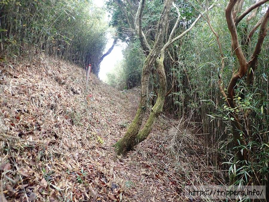 ここから山頂までは今までよりも背丈の高い笹道で傾斜があります。足元は雨などで濡れている場合、スリップしやすく掴まるものがないため注意が必要です。とても難路でした。