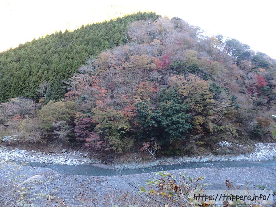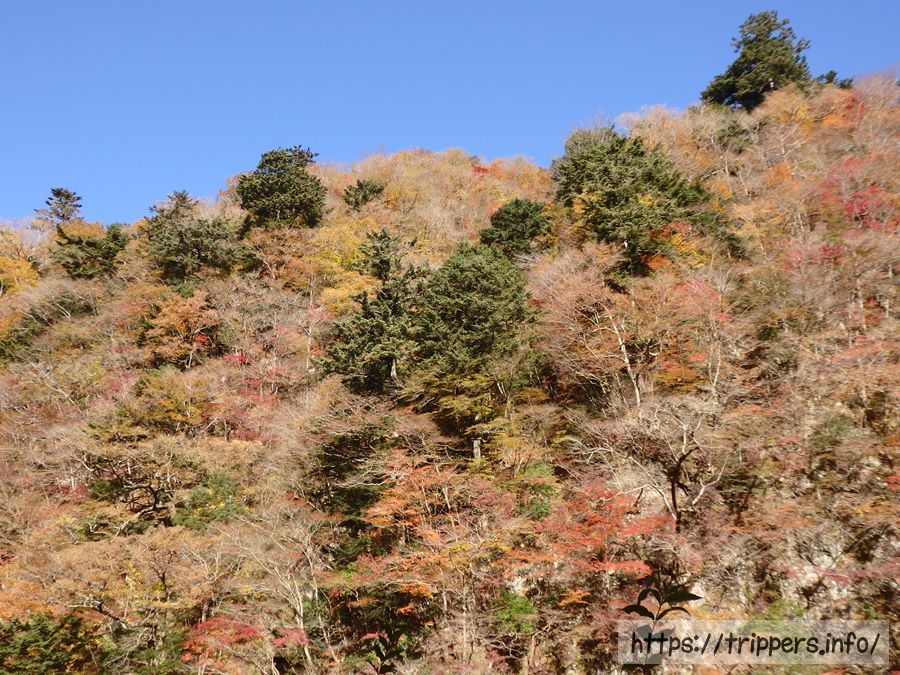 真っ赤で色鮮やかな紅葉とはいきませんが、渓谷の中にある大自然の紅葉は日光を浴びて輝いています。