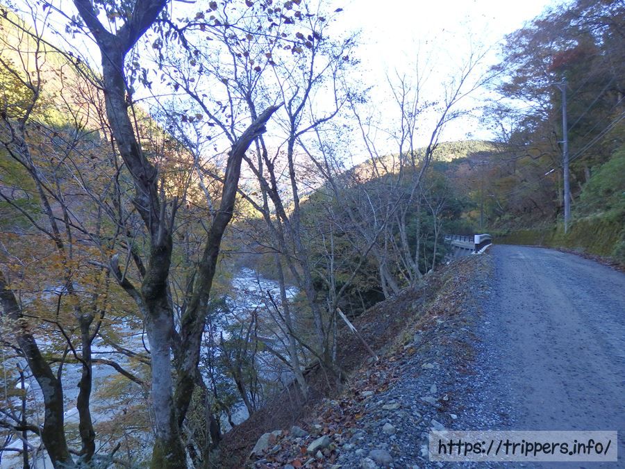 ユーシン渓谷へ向けて林道を歩いていきます。木々は紅葉し、雲一つない真っ青な空と乳白色がかった青い丹沢湖を目の前にすると、来て良かったと思います。