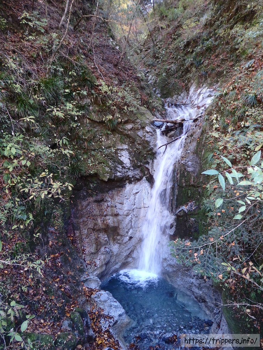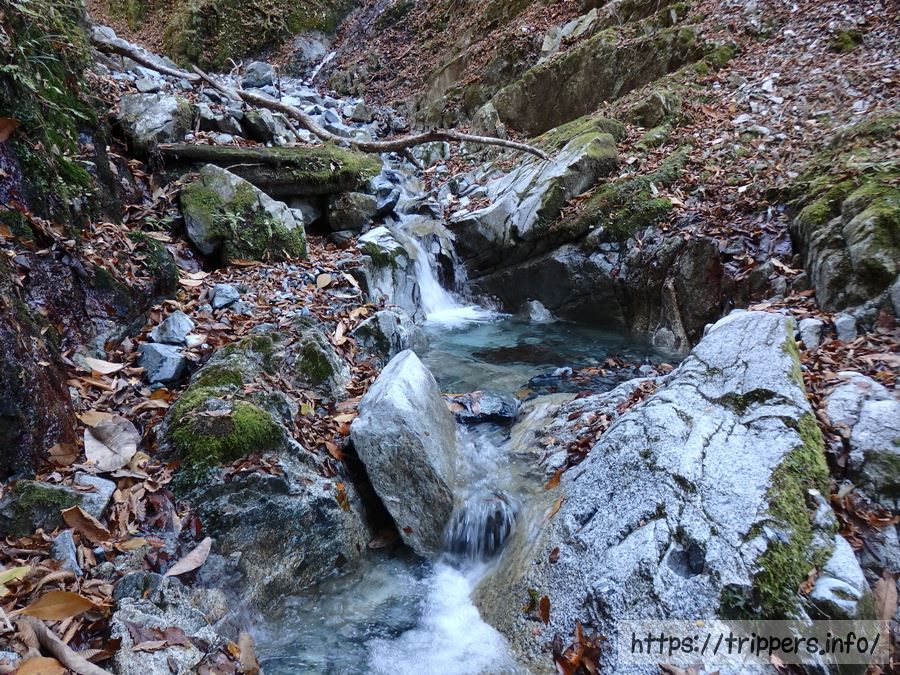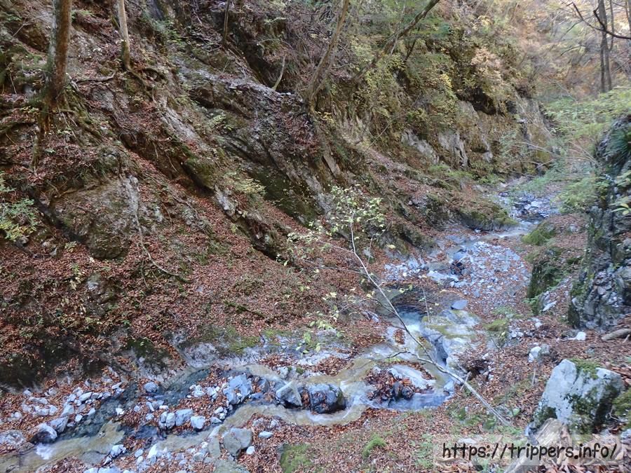 枯葉で埋め尽くされた地面に、沢が流れている部分だけ綺麗な青になっているのは、自然の芸術。筆で沢を描いてるみたいです。