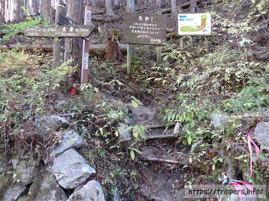 雨山橋に到着しました。ユーシン渓谷までは400mの立て札がありますが、ユーシン渓谷はもう楽しめたので、鍋割山へ向かう事にします。ここから坂を登っていきます。