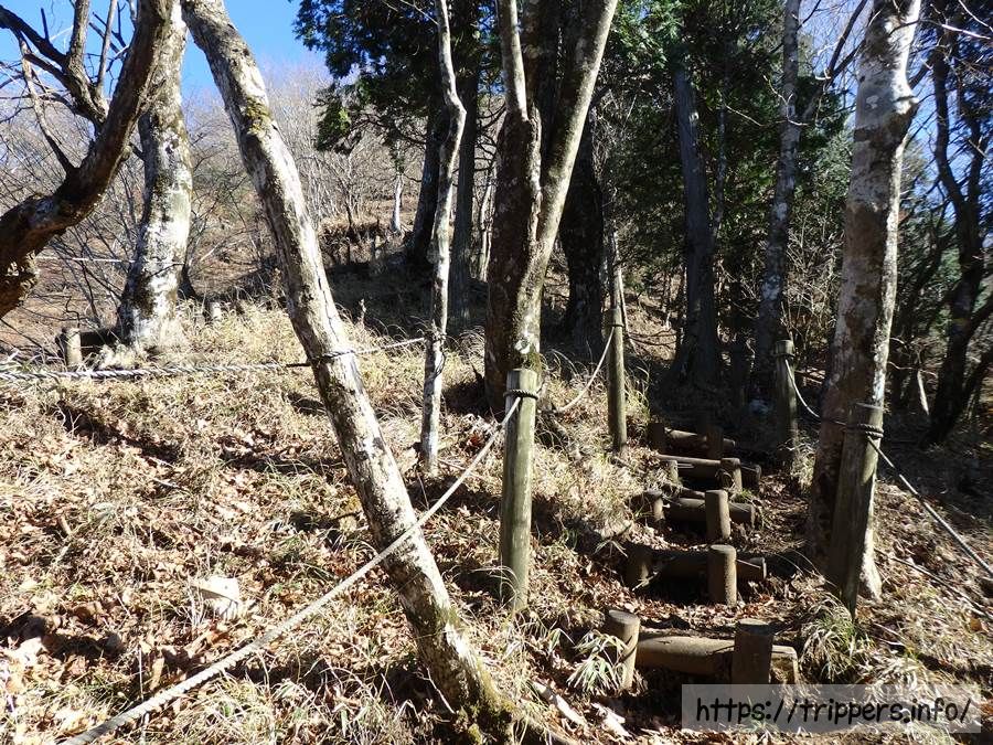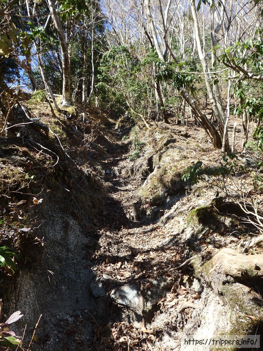 思った通り、整備が行き届いていないために、道が崩落してたり階段が壊れてたりします。ただ進めないわけではないので、そのまま雨山峠を目指します。