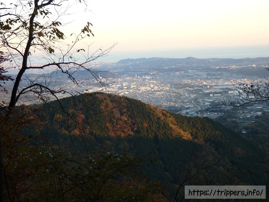 近くなってきた街も夕陽を浴びて、今にもカラスが飛び去りそう。日没前に下山できるのか。
