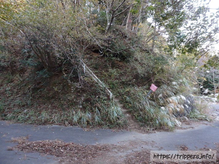 この階段を下りたら、アスファルトで舗装された林道を横切ります。