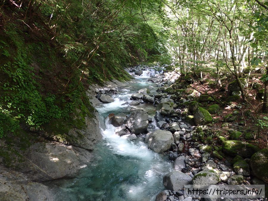 沢は変わらず綺麗で、青く澄んでいます。今回の加入道山へのルートは渡渉を繰り返します。ほとんどの木橋が流されて移動しており、機能してません。