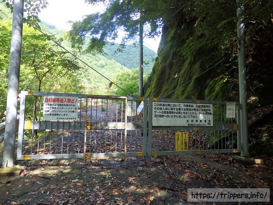 ゲートの右脇を通過します。ここら辺の西丹沢はヤマビルはいないと思いますが、生息域が広がっていたり、加入道山の北側(道志村)には生息していたような気がするので、スキンベープを靴に吹きかけ、落ち葉の中をなるべく歩かないようにします。結果としては、ヤマビルは見かけず、出血もありませんでした。