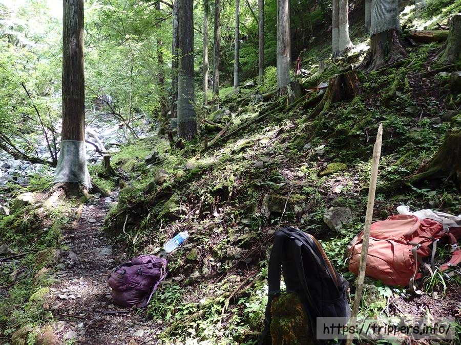 登山道を進んでいくと道に置かれたリュックが4つ。沢登りでもしているのでしょうか。見かける事はありませんでした。