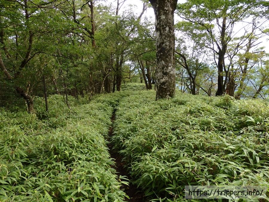 もし丹沢の北側からここまでヤマビルが分布域を広げたら、この藪笹では、なかなか防ぐのが難しそうです。「東のヒル、西のダニ」と言われる丹沢(北もヒル)で、大室山は西丹沢の領域ですが、ダニが沢山いる場所ではありません。もし世附周辺のようにダニだらけだったら、こんな場所はもう歩けない。