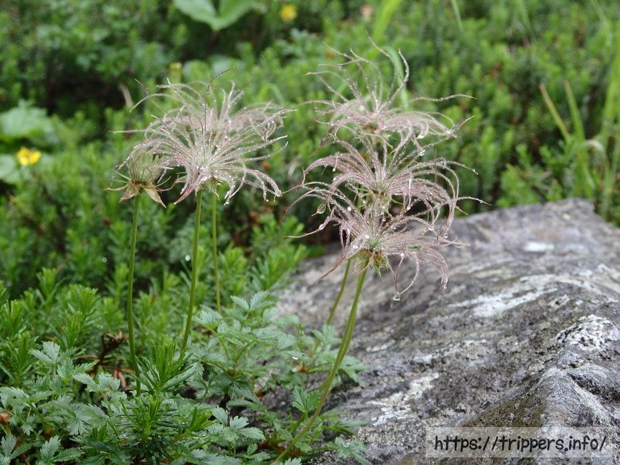 チングルマの穂が雨でオシャレになっています。背丈は小さいですが、立派な樹木です。
