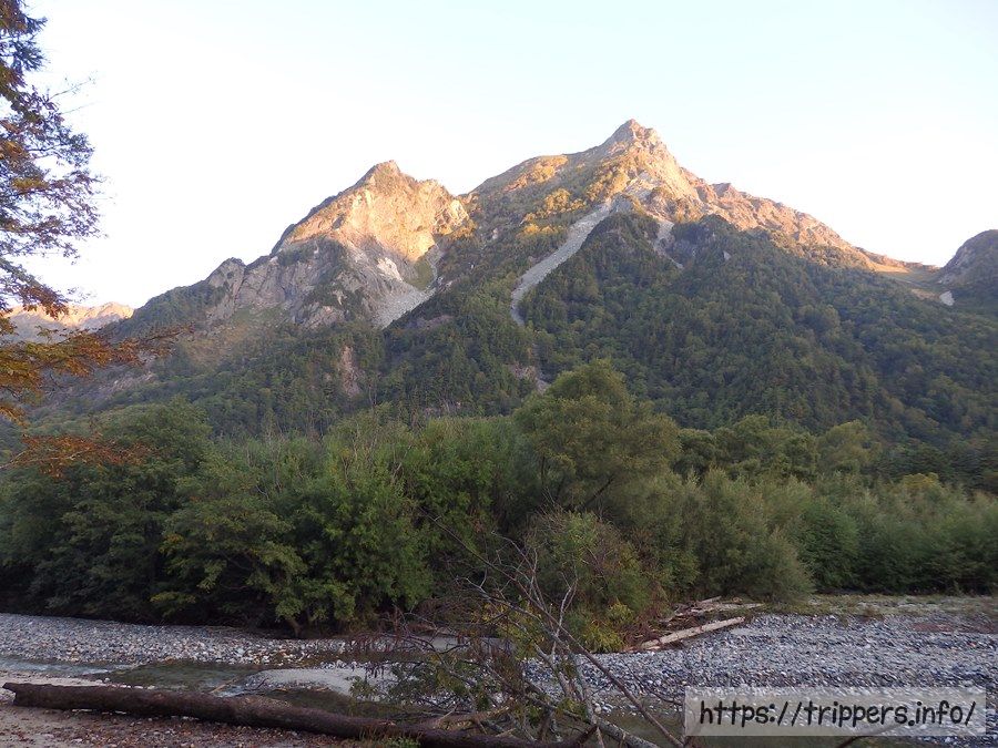 林道から見える朝日に染まった山は、左の頂きが明神岳で、右が前穂高岳でしょうか。