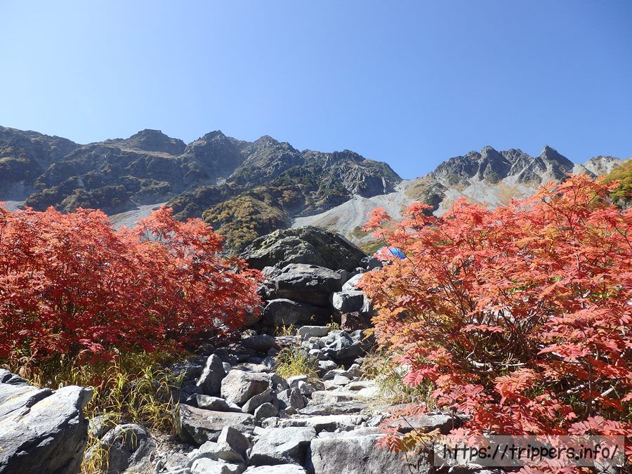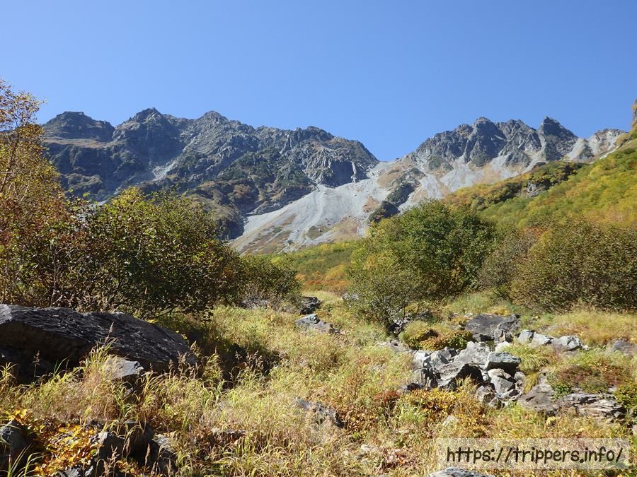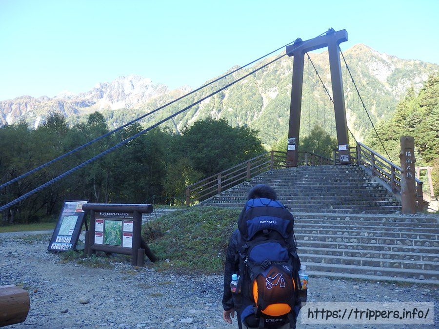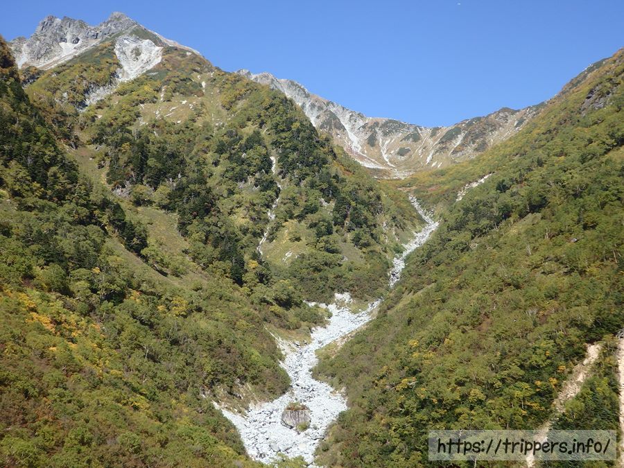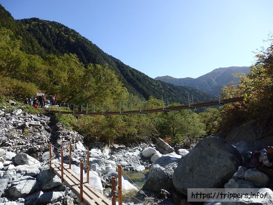 橋からは屏風岩が見えます。屏風岩の上にある屏風ノ耳からは涸沢カールの絶景が見られます。涸沢カールから上高地へ下山する時、パノラマコースを通った事がありますが、手こずった記憶があります。