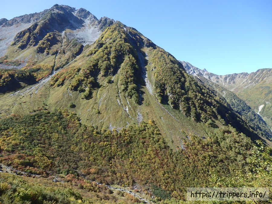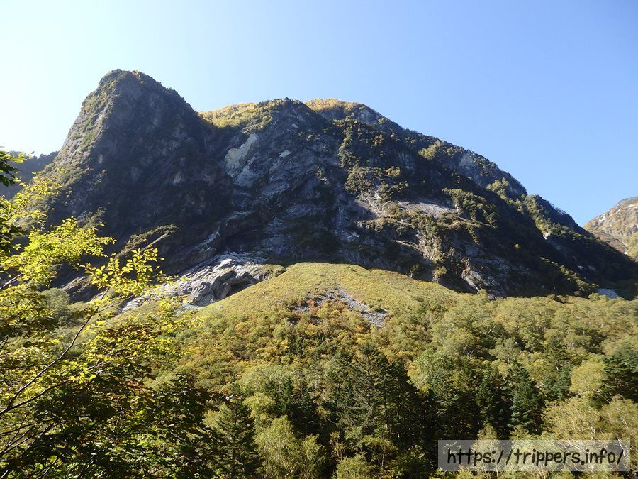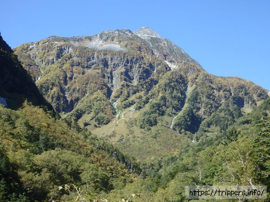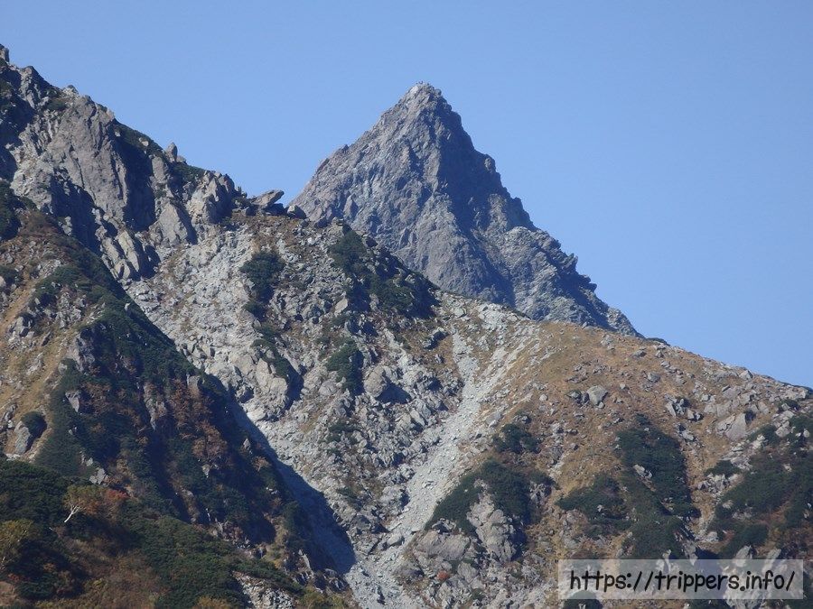 北穂高岳も見えます。山頂を拡大すれば、北穂高小屋が見えるようです。本谷橋を通った事がある登山者でも、屏風岩は知っているけれど、この山が北穂高岳だとは意外と知らないのではないでしょうか。