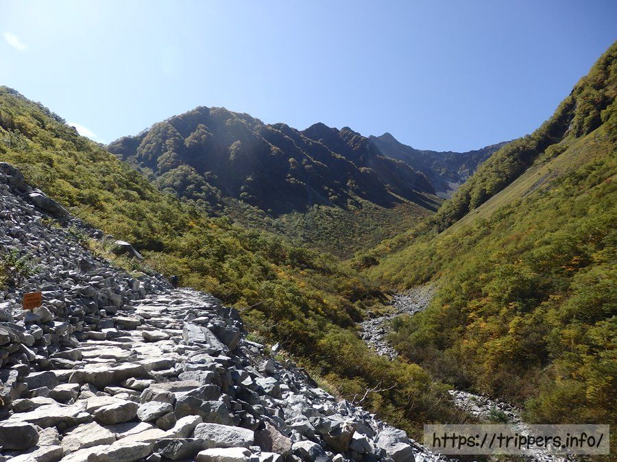 涸沢カールとその稜線上にある前穂高岳が見えてきました。この石畳の登山道はシャレオツ山道ですが、そんな言葉で済ましてはいけないくらい、整備に要した努力は想像を超えます。