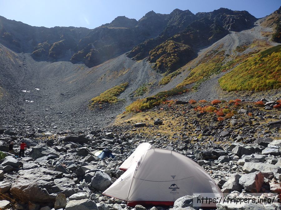 テントは中国メーカーNaturehikeの2人用です。2年前に初めて秋の涸沢カールにテントを泊しに来た時は、1つも見かけなかったこのメーカーのテントも、今回は幾つも見かけるようになってました。お隣さんも同じメーカーでした。