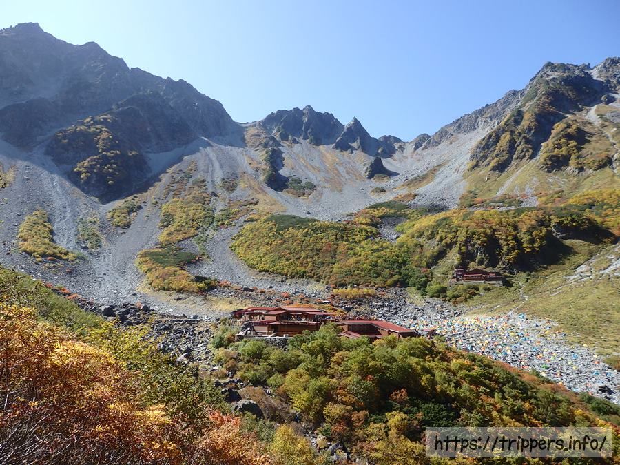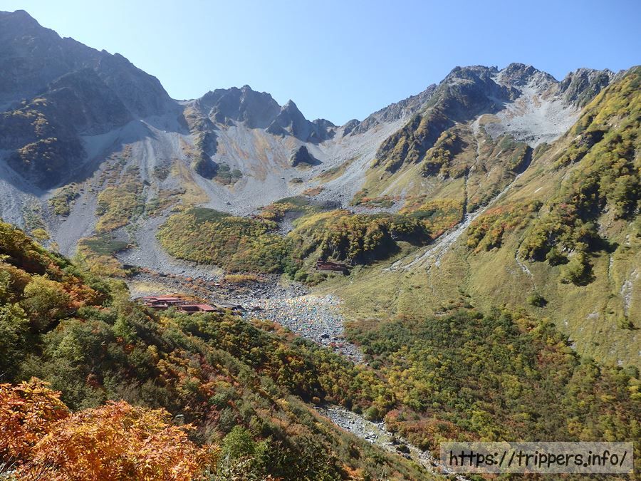 朝一に上高地から登山を開始した登山者のほとんどは、涸沢カールに到着した頃でしょうか。テントの数が増えています。夜行バスの「さわやか信州号」も増便されていました。