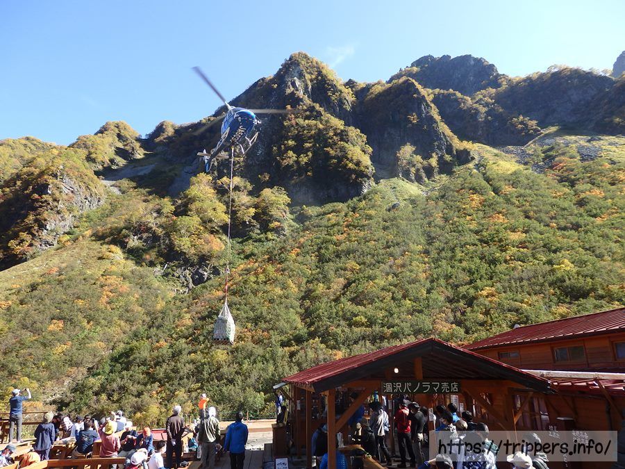 涸沢ヒュッテでは売店で昼食を注文するために長蛇の列ができていました。大混雑を見越してか、荷物輸送のヘリが何度も物資を届けに来ていました。