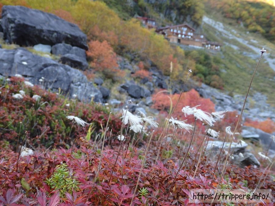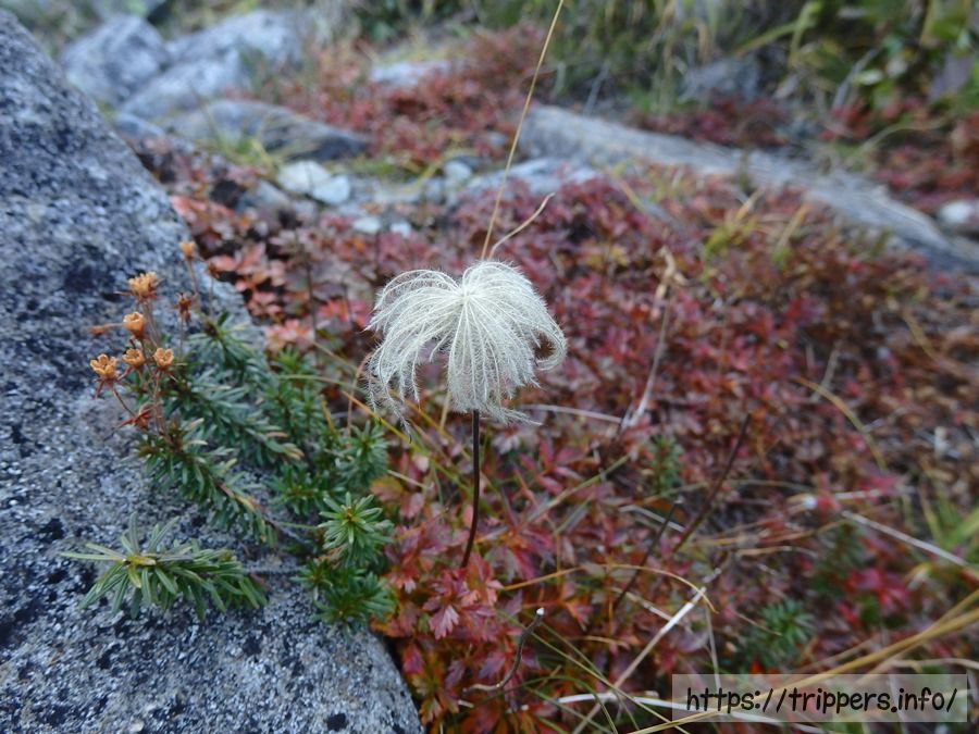 高山植物の中で大好きなチングルマです。白と黄色のコントラストが綺麗な花から始まり、ピンク色の穂、そして草紅葉へと遷移していきます。草紅葉終盤になるとピンク色だった穂が白くなるんですね。白髪みたいです。