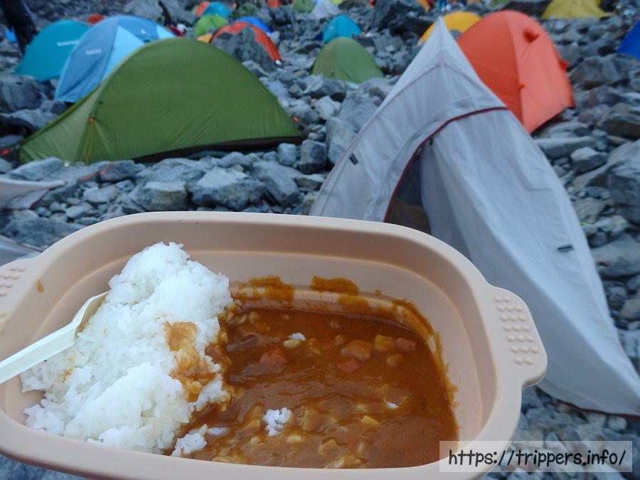 日が沈み始めたので、テント場に戻って夕食の準備です。小麦不使用カレーライスです。西尾食品のアルファ米ですが、食器によそって見栄えアップです。味噌汁で体を温めてテントに入り込みます。