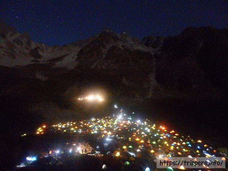 涸沢ヒュッテの展望スペースから、星空とテントのライトアップを見学しました。翌日の夜はもっとテントが増える事になります。