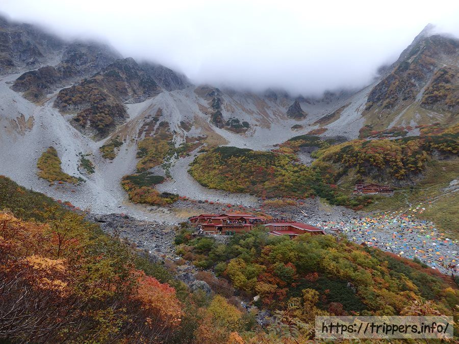 今日は上高地への下山日です。朝からガスガスで、モルゲンロートを見る事が出来ませんでした。穂高連峰の稜線はガスで隠れていますが、ガスが下に降りてくる気配はありません。時々、北穂高岳の先端が顔を出しています。