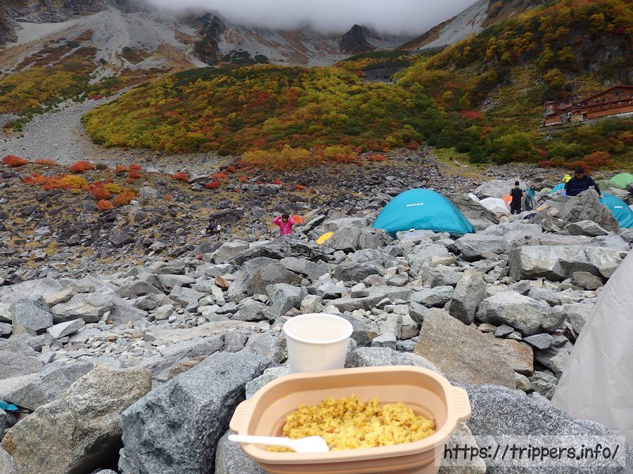 朝食はドライカレーです。早朝4時頃から、出発する登山者の物音が聞こえ、朝食を食べる頃には多くのテントが撤収していました。上高地から乗車する新宿行のバスは15時発なので、それに間に合うように下山をします。