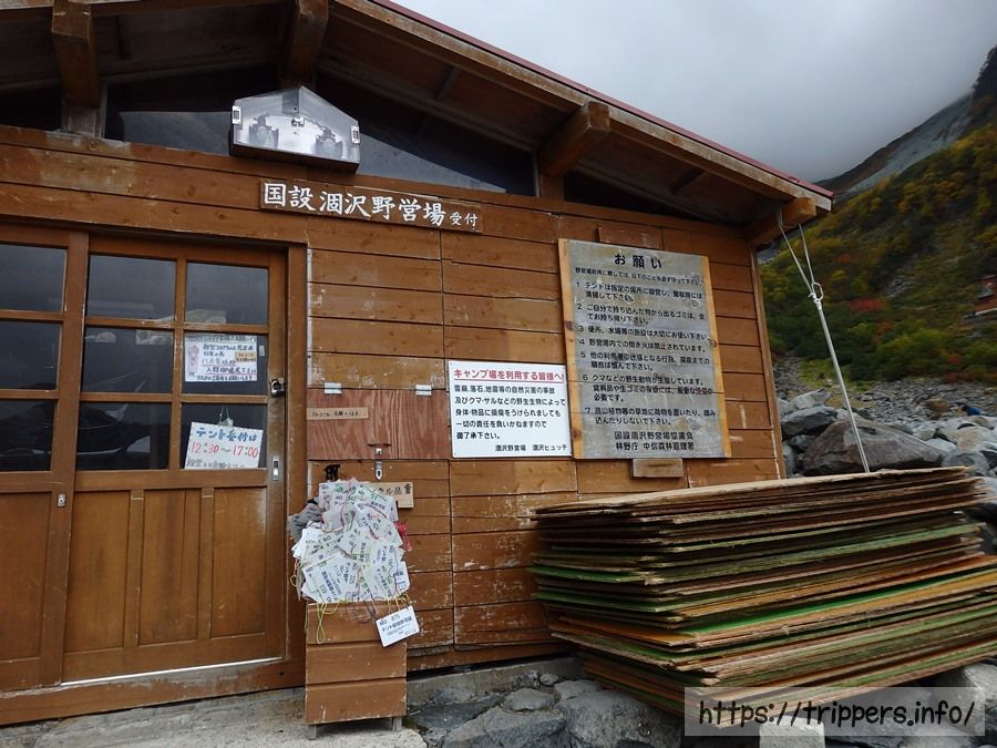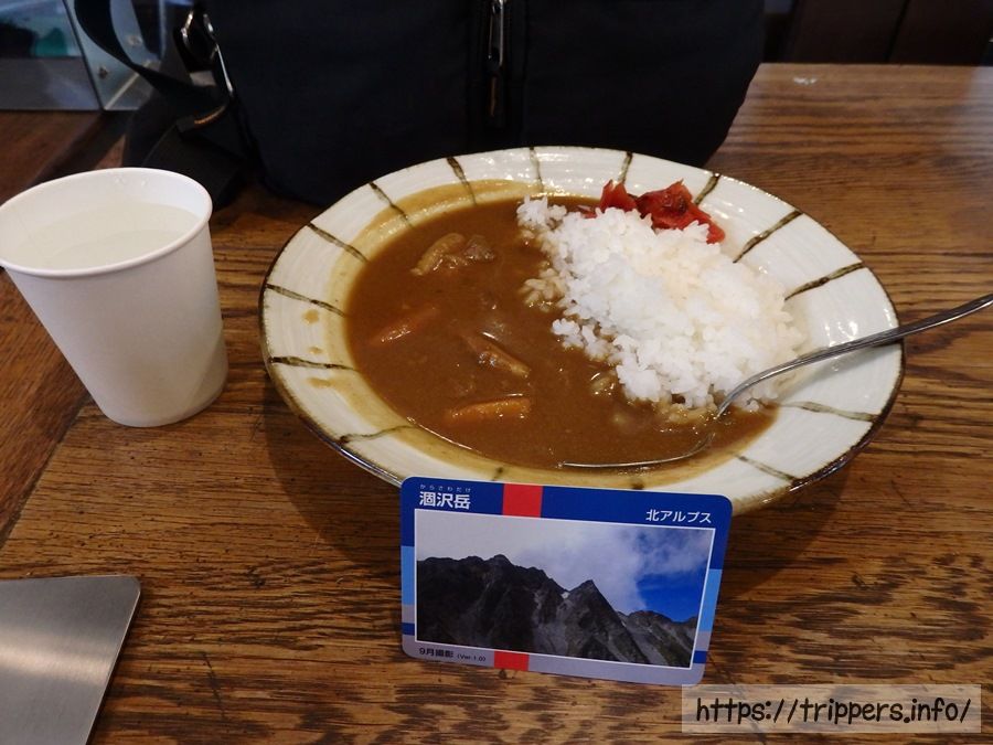 「山の手作りカレー」を注文しました。分厚い豚肉が入っており、とっても美味しかったです。手前に置いてある山カードは、横尾にいた長野県警察に声をかけて頂きました。話しかける時はちゃんとマスクを装着してます。奥穂高岳の山カードは在庫切れでしたが、涸沢岳はなんとか手元にあったようで、良いお土産になりました。