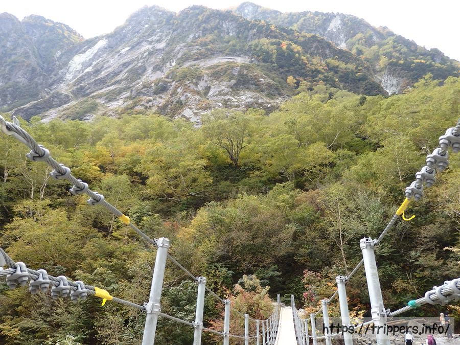 本谷橋に到着し、お菓子休憩です。橋を渡る登山者を観察していると、恐る恐る渡る人や、動画で自撮りする人、橋をあえて揺らして渡る人など十人十色です。