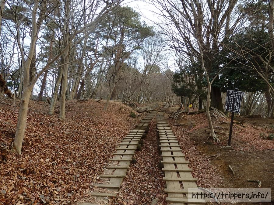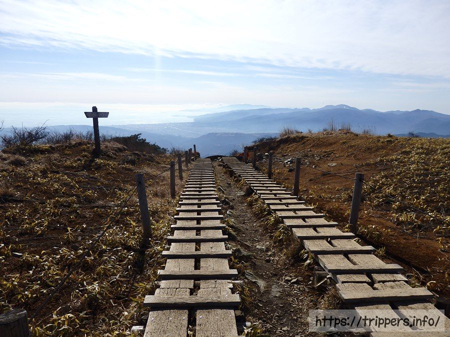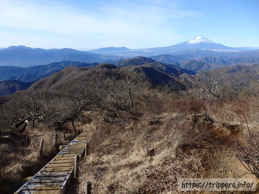 ここで「大倉尾根あるある」です。①ここで一度は写真を撮りがち。地平線に続いているような木道はやっぱり絵になります。②木道の凹凸の幅が歩幅と合わなくて意外と歩きにくい。