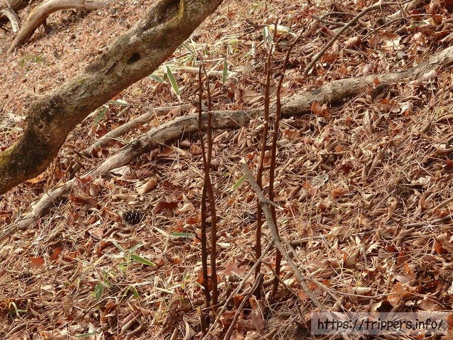 多様な植物を観察できる時期ではないので、黙々と進んでいきます。去年実を付けていたツチアケビの茎がちゃんと残っていました。地面に枝が刺さっていると、もしかしてツチアケビの茎ではないかと、ちょっと気になります。