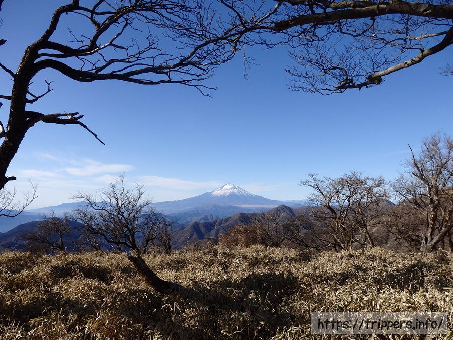 今日は空気が澄んでおり、富士山が良く見えます。塔ノ岳と丹沢山の間にある主稜線から観る富士山が好みなので、丹沢山まで歩こうかと考えてしまいます。時間もあるし、足もまだ限界ではありません。腰の痛みは、イナバウアーしながら歩くと全然楽です。