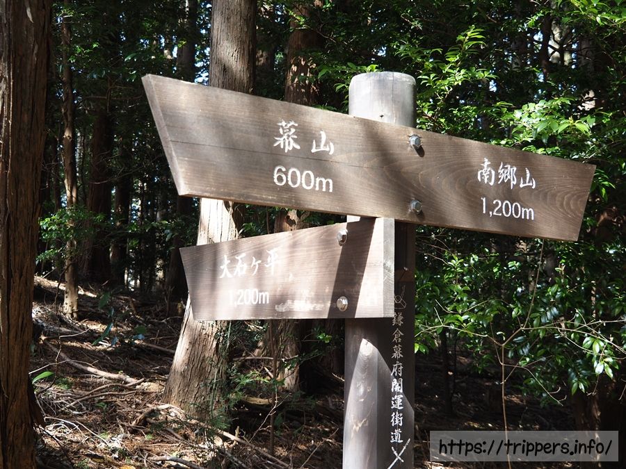 南郷山へ向かいます。登山ルートは、鎌倉幕府開運街道と呼ばれるようです。すれ違う登山者の数は格段に減ります。自鑑水を経由していきますが、道が少し分かりづらいです。標識や手書きの文字を読みながら正しい道を選択していきます。