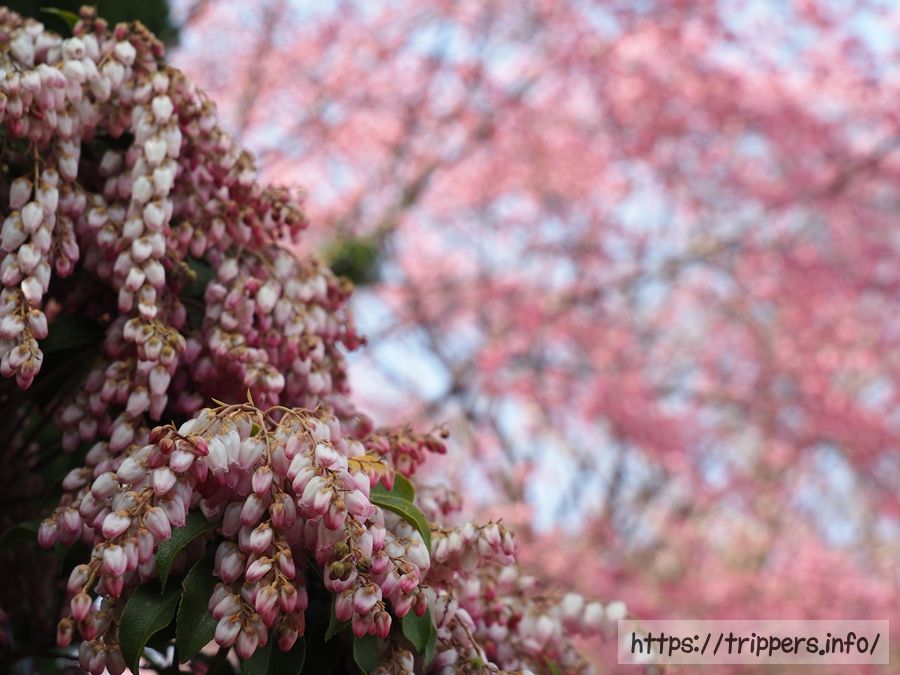 トイレは幕山公園にしかなかったため、川堀公園に立ち寄りました。桜を背景に、園芸品種のアケボノアセビがとっても綺麗でした。