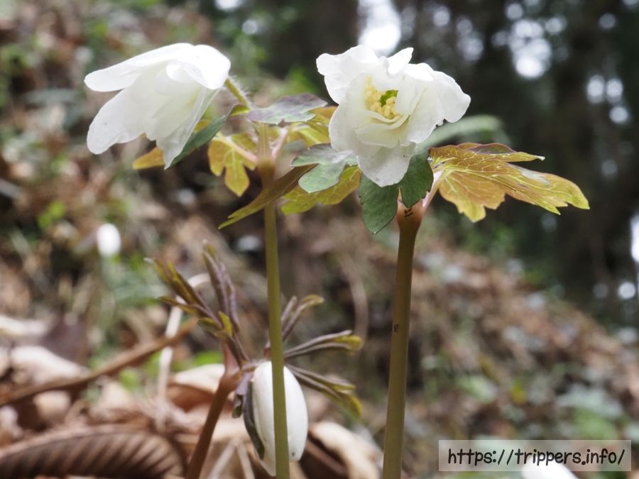 道を歩いていると、白い花が斜面の一部に群生していました。葉の形からキンポウゲ科のようです。キンポウゲ科であるオキナグサやツクモグサ、福寿草の葉っぱと似ているので、そちらのお仲間だとは植物に詳しくなくても思いました。