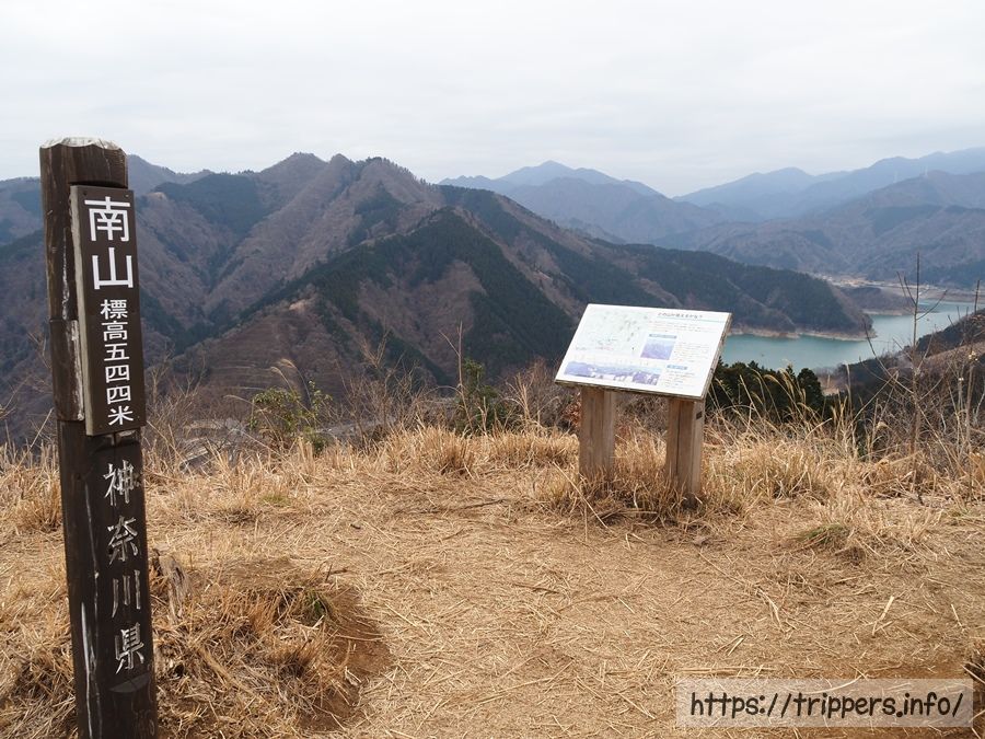 標高544mの南山の山頂へ到着し、軽食タイムにします。左側に見える山は仏果山と高取山です。そっちもヤマビルの聖地ですね。宮ヶ瀬湖の眺めは天気が悪くても抜群です。丹沢山塊を眺めると、どうやら積雪があるようで、塔ノ岳では霧氷が楽しめていたと思います。
