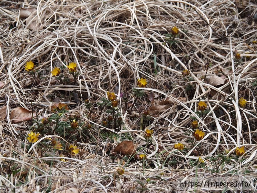 福寿草を発見しました。思っていたより数が少ないと思っていたら、イノシシによって踏み荒らされて数が減ったと地元の人が言っていました。