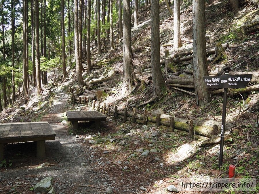 雨山峠に到着し、少し休憩しながら計画を再考します。峠には富士山の展望とベンチがあります。