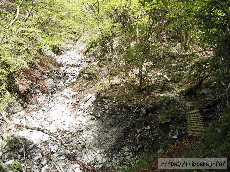 ここから本格的な登山になっていきます。ここから雨山峠へのルートの一部が破線になっている登山地図があります。初めて歩くルートでしたが、問題なく歩けました。何度も渡渉するため、雨後の水量が増量した時は利用したくない登山道でした。