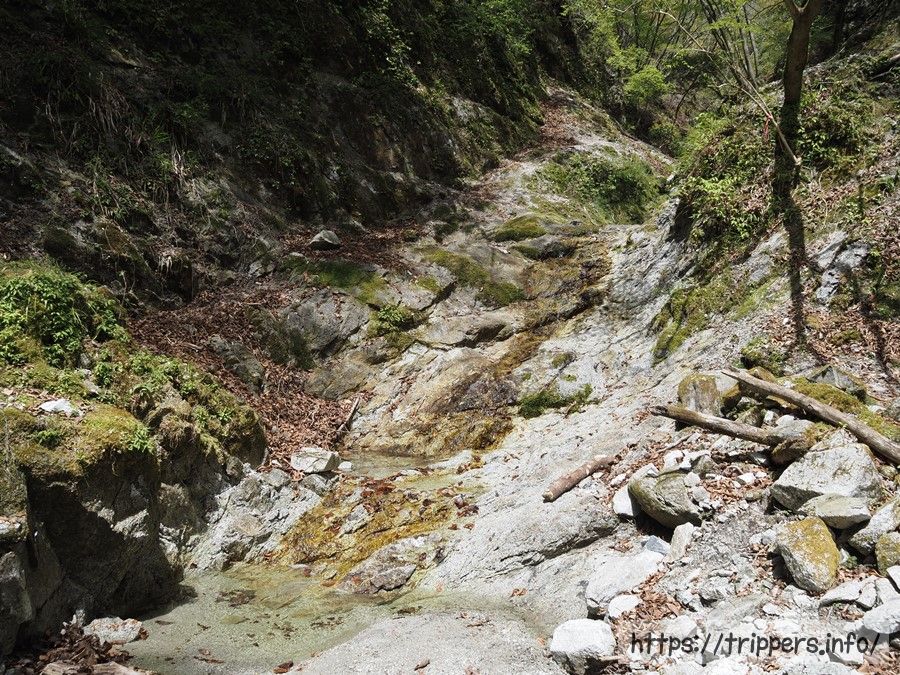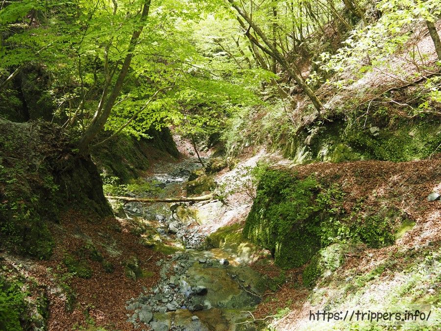 雨山峠まであと少しの所まで来ると、沢歩きになりました。雨後でないため、水量はあまりなく、靴を濡らさずに歩けました。登山者が多く訪れる丹沢の有名ルートでは、枯れたような沢歩きはないため、新鮮でした。。