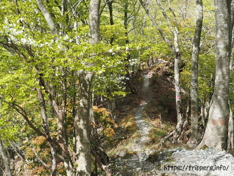 標準タイム通りに雨山・檜岳・伊勢沢ノ頭を登っても、最終バスに間に合うので、向かうことにしました。標高が低いため、シロヤシオが咲いていました。塔ノ岳から丹沢山の尾根や、檜洞丸のシロヤシオは2週間後くらいに咲くでしょうか。