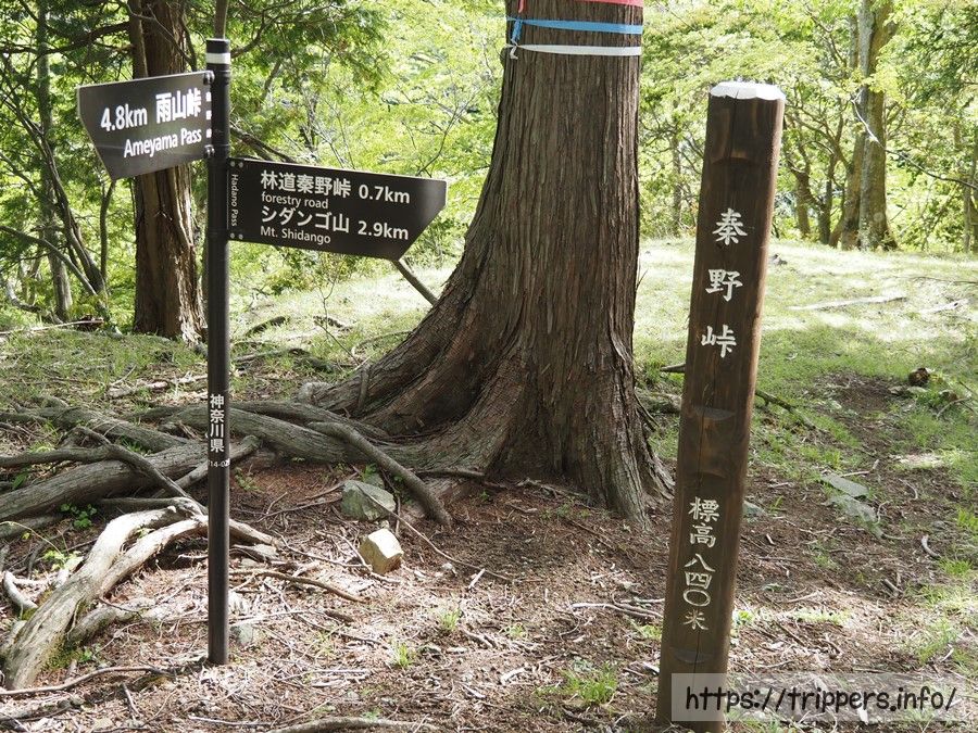 秦野峠までやって来ました。伊勢沢ノ頭から長かったです。急で滑りやすく痩せた登山道でした。登山道はまだまだ続きます。