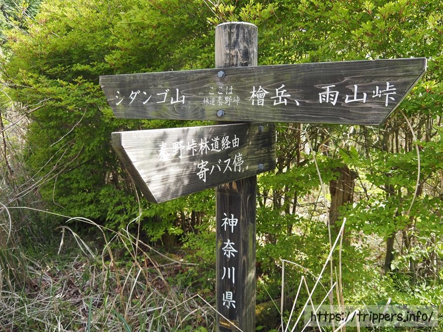 無理をして急いだわけではないですが、標準タイムより1時間早く到着できました。標準タイム通りだったら、ユーシンロッジの方へ下らずに、雨山・檜岳・伊勢沢ノ頭の3座を周回し、秦野峠の林道を経由して寄バス停へ行こうと考えていました。